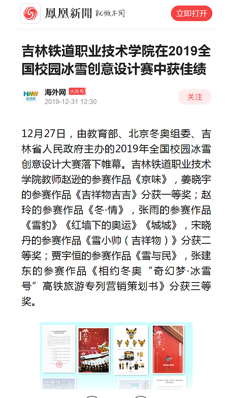 12月31日,《凤凰网》等媒体以“吉林铁道职业技术学院在2019全国校园冰雪创意设计赛中获佳绩”为题,对我校教师在大赛中取得优异成绩进行了报道。
