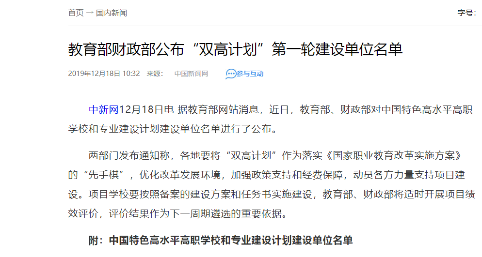 12月18日,中国新闻网、教育部官网、中国青年报等媒体对中国特色高水平高职学校和专业建设计划建设单位名单进行了公布,我校入选高水平专业群建设单位(C档)。