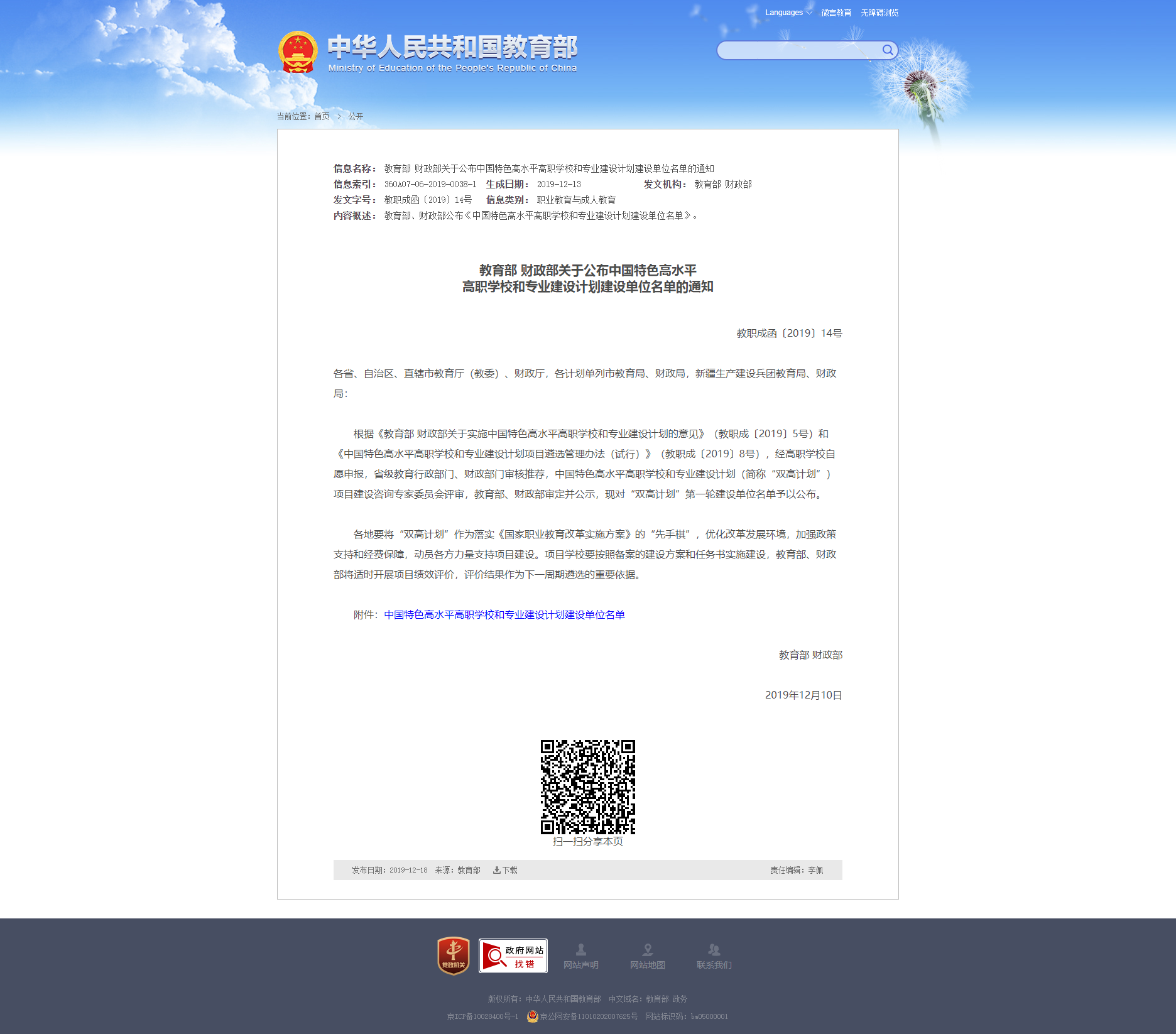 教育部官网链接:http://www.moe.gov.cn/srcsite/A07/moe_737/s3876_qt/201912/t20191213_411947.html