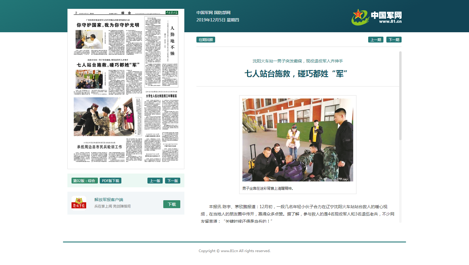12月5日,《中国国防报》(第二版)、《中国军网》和《人民网》以“七人站台施救,碰巧都姓‘军’”为题,报道我校铁道运营管理专业2017级学生王泽丞和其他几名现役军人和退伍老兵在沈阳火车站站台救人的暖心事迹。