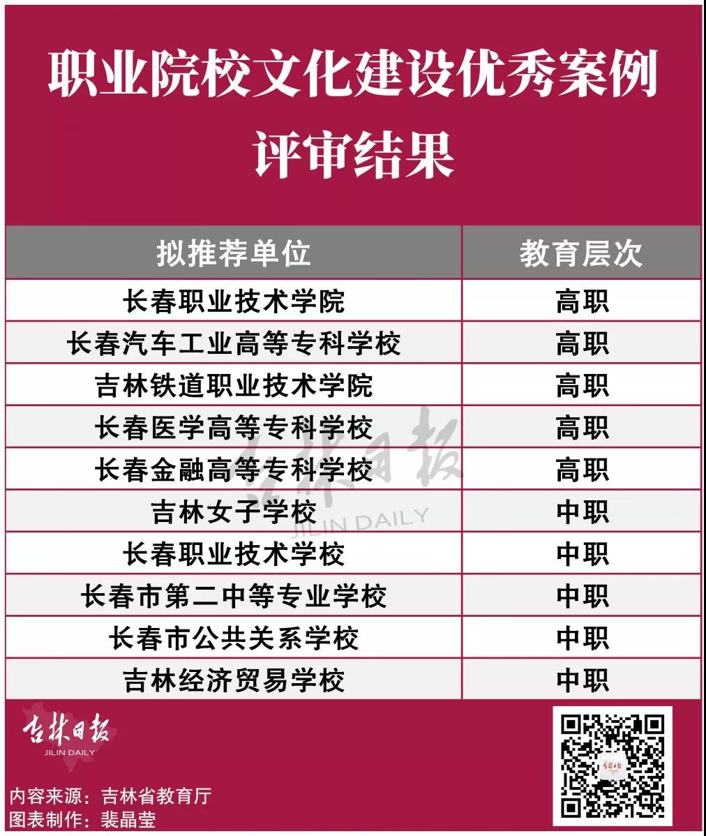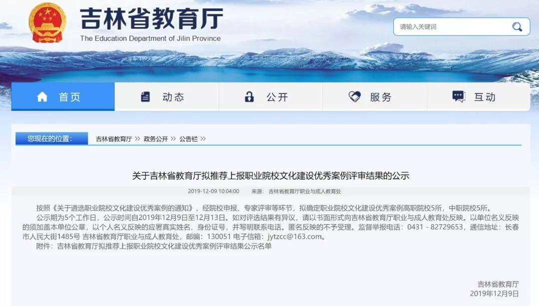 【吉林日报】近日,吉林省教育厅公示拟推荐上报职业院校文化建设优秀案例评审结果。按照《关于遴选职业院校文化建设优秀案例的通知》,经院校申报、专家评审等环节,拟确定职业院校文化建设优秀案例高职院校5所,中职院校5所。