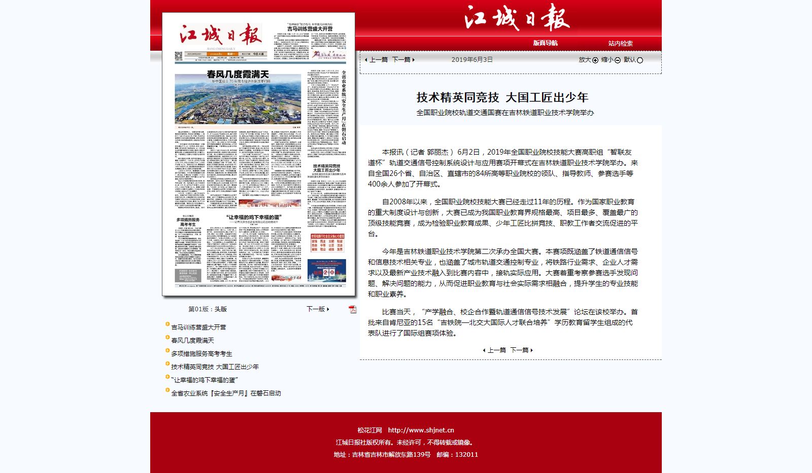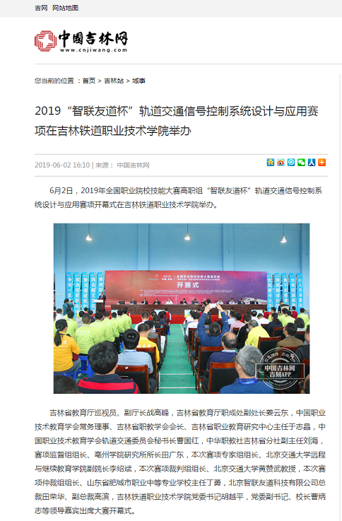 6月2日,《中国吉林网》《吉林广播电视台》《吉林教育电视台》《吉林市电视台》《江城日报》以“2019‘智联友道杯’轨道交通信号控制系统设计与应用赛项在吉林铁道职业技术学院举办”为题,报道我校承办2019年全国职业院校技能大赛高职组“智联友道杯”轨道交通信号控制系统设计与应用赛项情况。