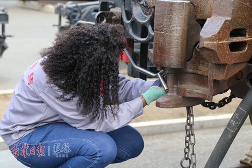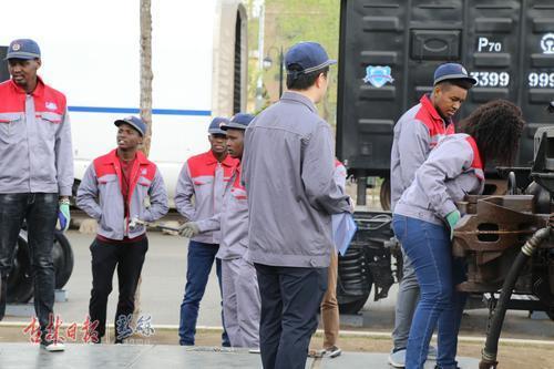 正在忙碌的是吉铁院肯尼亚铁道车辆1901班的留学生。他们正在进行分解组装17号车钩钩头技能表演赛呢。
